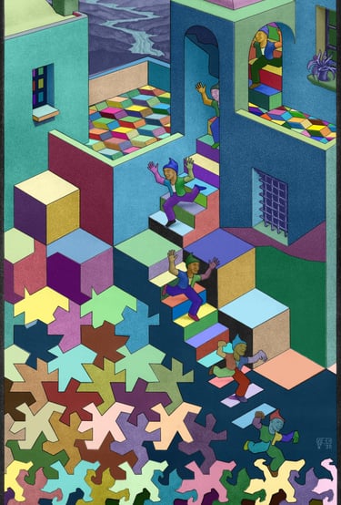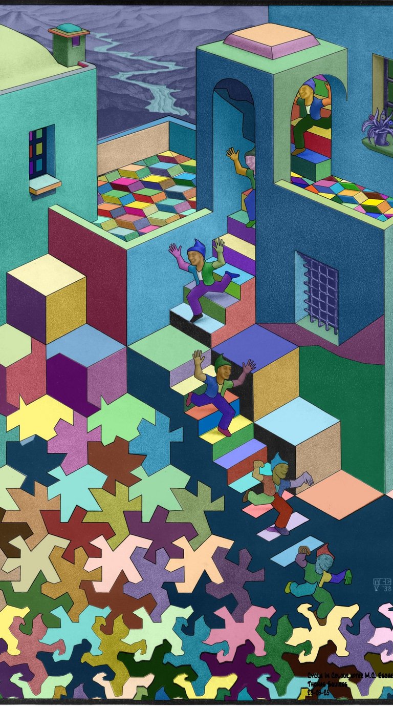 M.C. Escher's cycle artwork made in colour using inkscape.